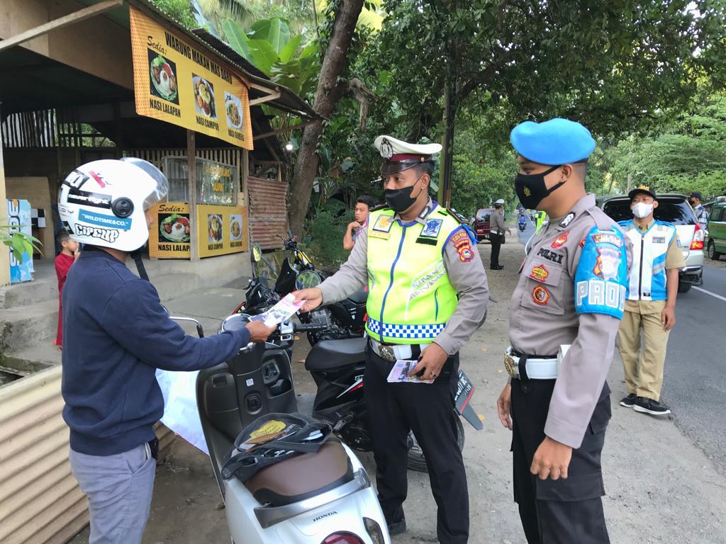 Hukrimntb.com | Lombok Utara,Polda NTB – Satuan Lalu Lintas (Sat Lantas) Polres Lombok Utara membagikan brosur yang berisikan imbauan pada pengendara baik R2 (roda dua) maupun R4 (roda empat) sebagai upaya menciptakan keamanan, keselamatan, ketertiban dan kelancaran lalu lintas (Kamseltibcarlantas) di wilayah hukum Polres Lombok Utara, Jumat (15/7/22).