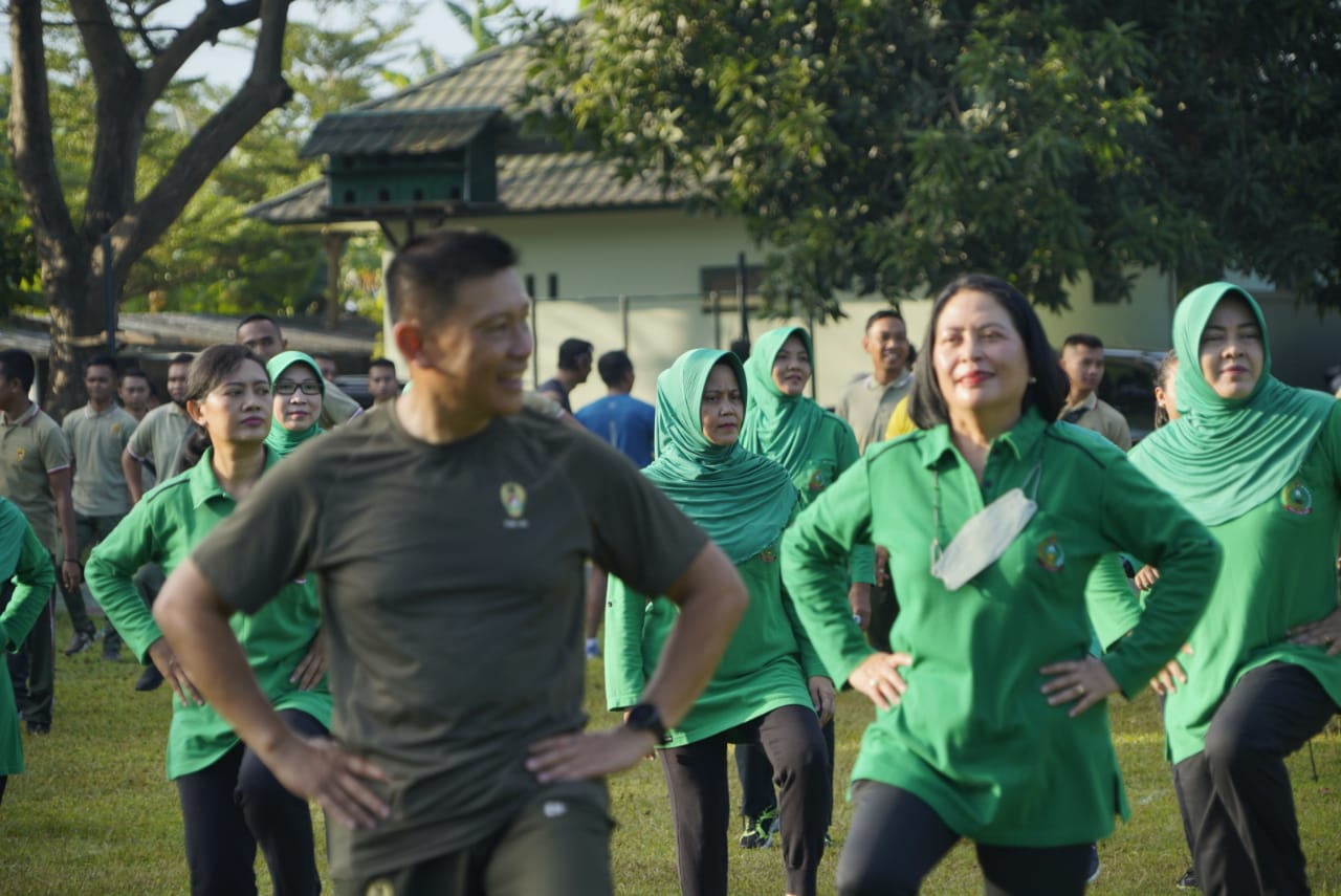 Dalam pelaksanaan olahraga bersama, Brigjen TNI Sudarwo Aris Nurcahyo, S.sos., M.M., didampingi Istri Ny. Asmeri Aris Nurcahyo selaku Ketua Korcabrem 162/WB bersama seluruh Prajurit dan Anggota PNS.