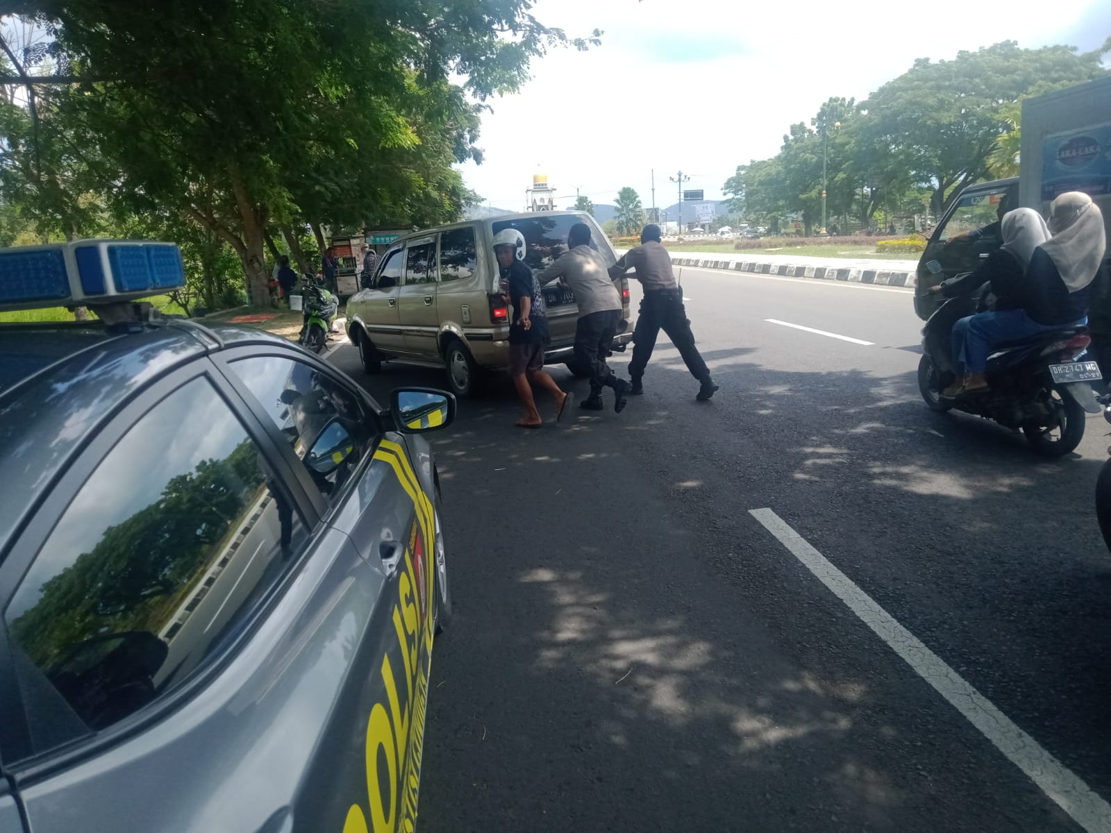 Membantu warga di Jalan Raya Bil 1 Gerung yang Kendaraanya mengalami mogok di tengah jalan untuk di pinggirkan guna tidak menggangu kelancaran pengguna jalan raya yang lainya.