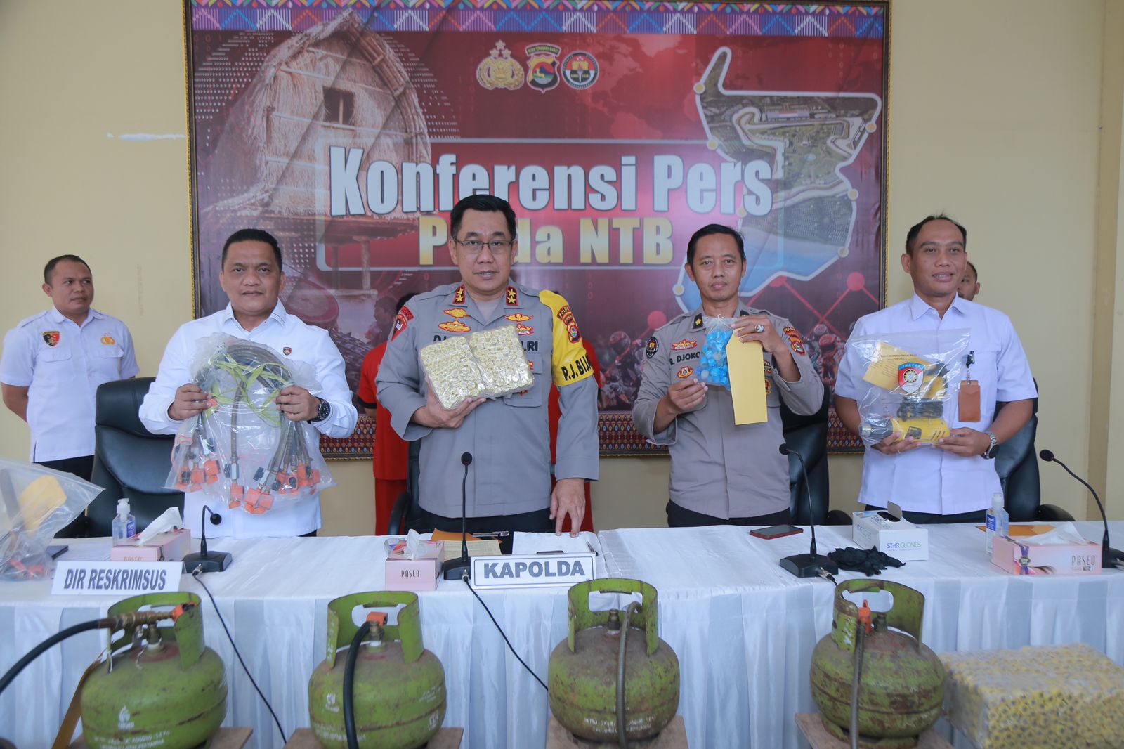 Beberapa barang bukti yang berhasil diamankan diantaranya 68 tabung gas 3 Kg. (51 masih segel dan 17 kosong), 57 tabung gas 12 Kg. (30 tersegel dan 27 kosong), 22 Tabung Gas 5,5 Kg. yang masih kosong, 10 buah slang regulator, dan 1400 tutup segel baru yang belum terpakai.