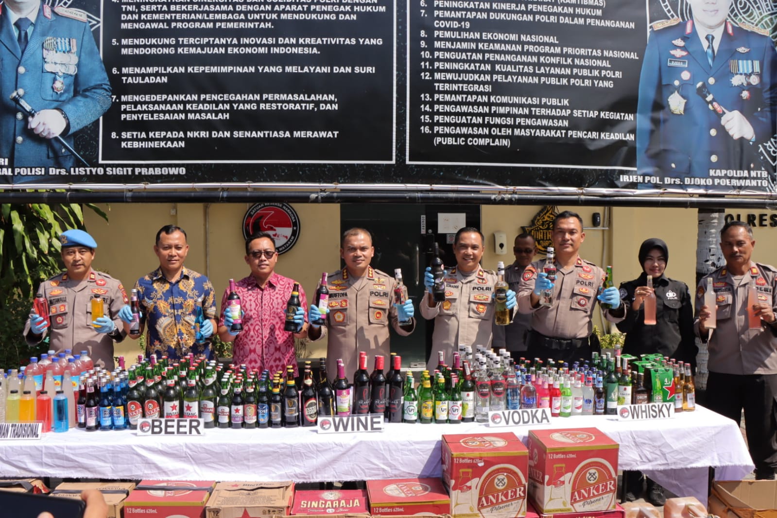 Dari kegiatan yang dilakukan 2 hari tersebut, Polresta Mataram Menyita 1003 Botol Minol/miras berbagai jenis diantaranya 402 botol Miras Tradisional (Jenis Tuak), 114 botol Miras Tradisional (Jenis Brem), 89 botol Miras Tradisional (jeris Arak), 43 Botol Minol Anggur, 51 Botol Bir Hitam, 175 botol bir Putih, 82 botol Vodca, serta 47 botol Wisky.
