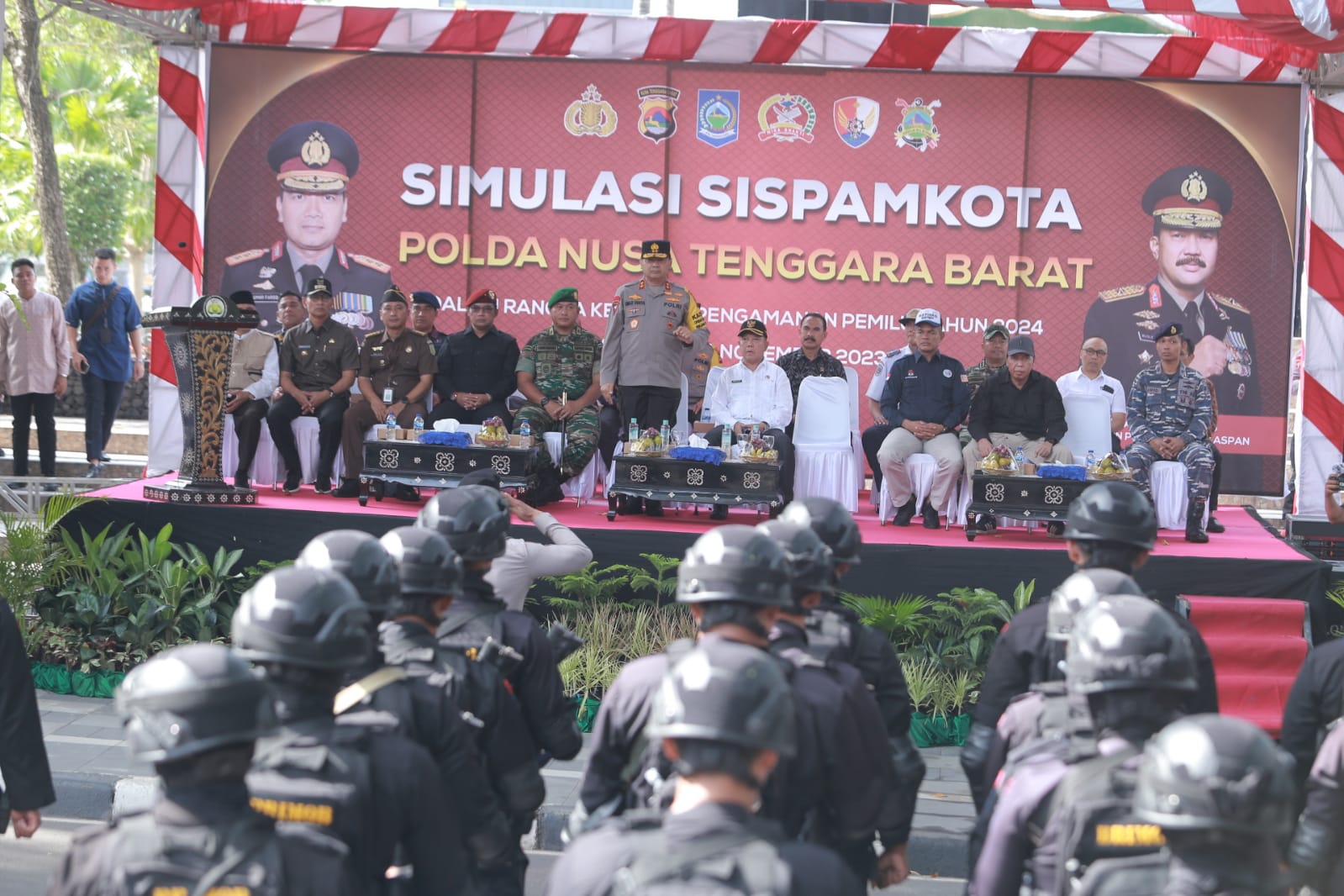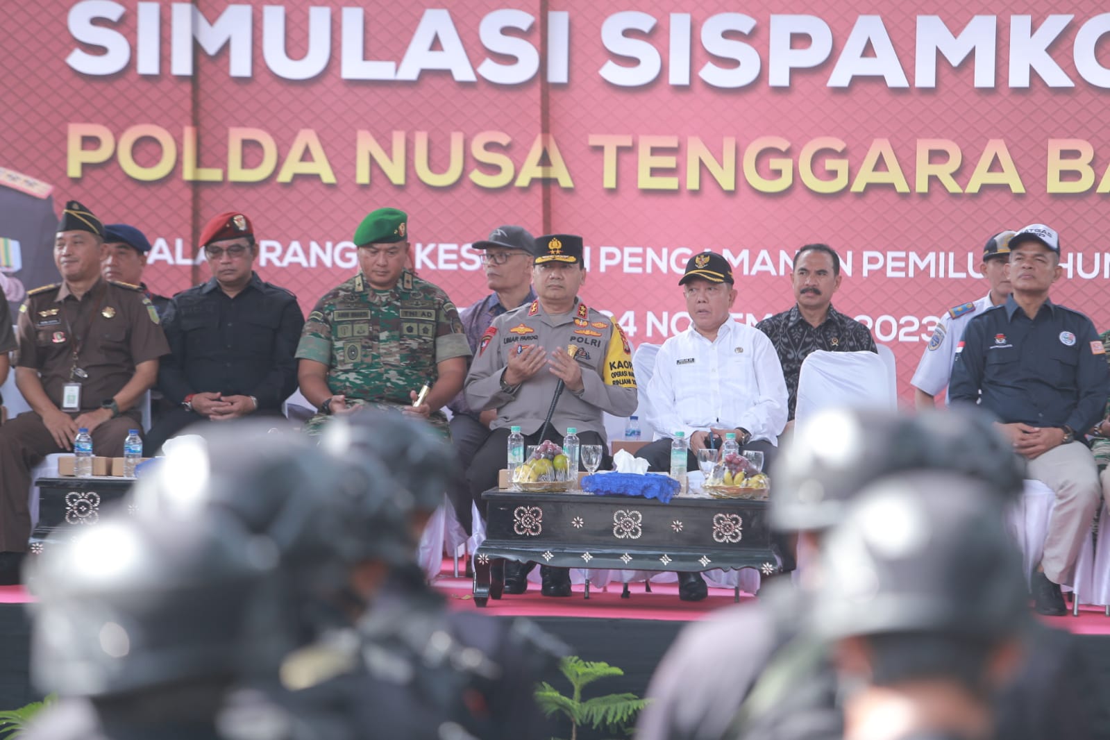 Simulasi tersebut disaksikan Kapolda NTB, Danrem 162/WB, Pj Gubernur NTB, Kepala Kesbangpol NTB, Kepala Kanwil Kemenkumham NTB, Kejati NTB, Kejari Mataram, Ketua KPU Provinsi NTB dan Kota Mataram, Ketua Bawaslu NTB dan Kota Mataram, segenap PJU Polda NTB, wali kota Mataram, Ketua DPRD Kota Mataram, segenap Kapolres/ta Se Jajaran Polda NTB, serta para undangan tokoh masyarakat, Tokoh Agama, tokoh politik.