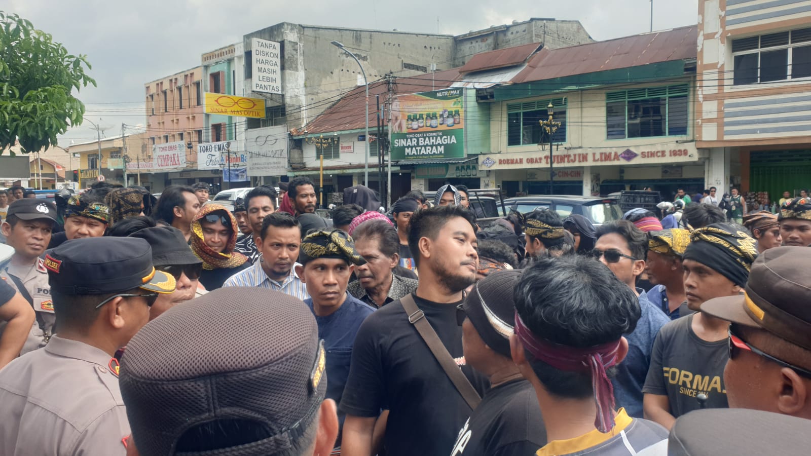 MATARAM – Polresta Mataram bersama satuan Polda NTB mengamankan jalannya aksi unjuk rasa yang digelar oleh Solidaritas Masyarakat Lombok Tengah Merang Tastura di Hotel Lombok Plaza.