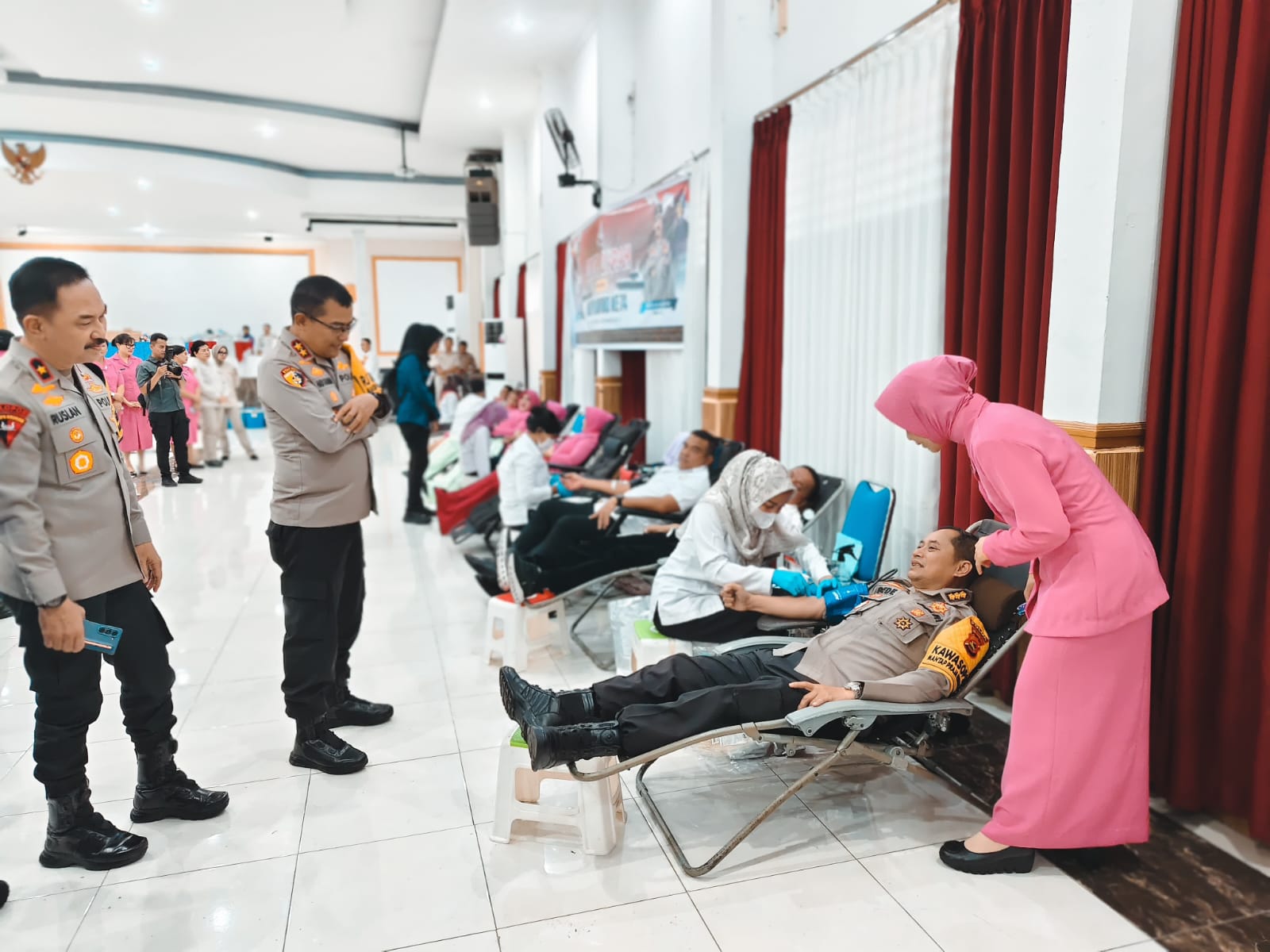Hukrimntb.com | Mataram NTB – Kapolda NTB Irjen Pol. Hadi Gunawan SIK., beserta Ketua Bhayangkari Daerah NTB Ny. Santy Hadi Gunawan menghadiri kegiatan Bakti sosial Donor darah yang diselenggarakan Direktorat Polairud Polda NTB dalam rangka Hari Ulang Tahun (HUT) Polairud ke 74 di Gedung Sasana Dharma Polda NTB, Senin (04/11/2024).