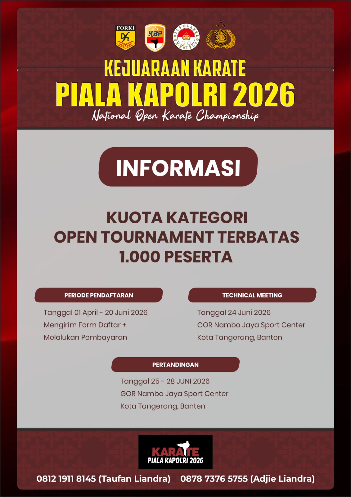 Hukrimntb.com | Tangerang – Kejuaraan bergengsi Karate Piala Kapolri 2026 siap digelar dan menjadi ajang unjuk kemampuan para atlet dari seluruh penjuru Tanah Air.